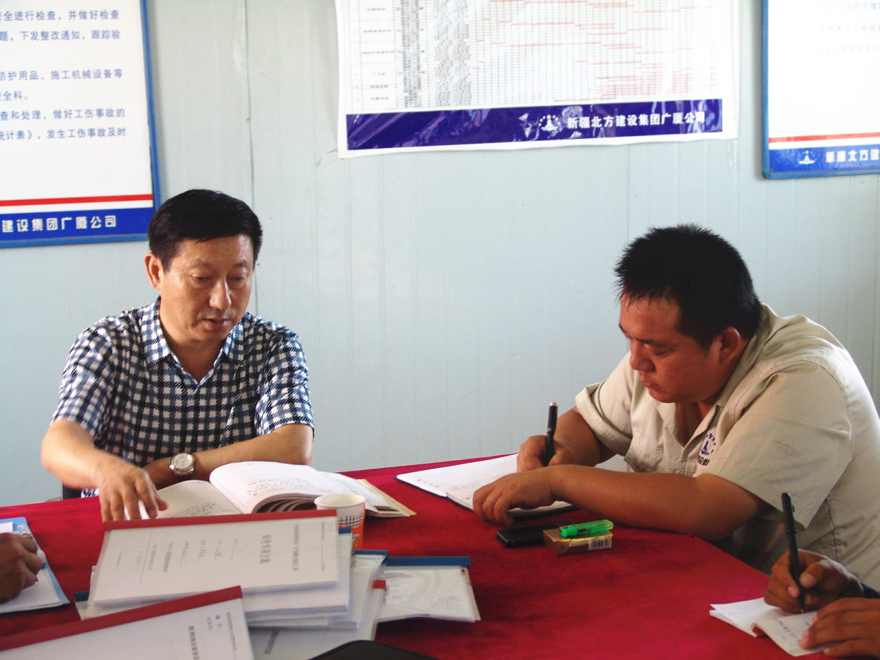 在科室人員查閱對應資料時(shí),薛總翻看了每一位項目人員的施工日志,并提出要求:施工日志不是個(gè)人日記,應該寫(xiě)出與施工相關(guān),有針對性的記錄。要有工程名稱(chēng)、施工場(chǎng)所、施工人員,要有“我”在干什么,要有大事件。在檢查現場(chǎng)薛再次強調:一、希望人人參與到安全的管理中,參與到項目的管理中,僅僅做好自己的工作,不考慮安全,不考慮項目贏(yíng)不贏(yíng)利這是不合格的。要多動(dòng)腦,勤思考。多為項目分憂(yōu)。二、安全生產(chǎn)月不光是口號,要落到實(shí)處,做到實(shí)處。要確確實(shí)實(shí)將安全放在每一個(gè)人心中。