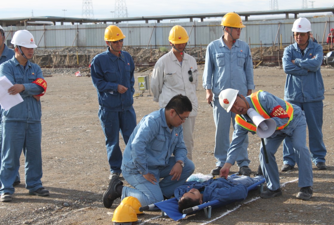 6月25號早晨八點(diǎn)半,北方建設集團獨山子公司組織產(chǎn)品罐區施工人員在天利實(shí)業(yè)輕餾分利用項目參加安全應急演練,演練分三個(gè)階段進(jìn)行,一階段正在作業(yè)的施工人員聽(tīng)到警報后,立即在HSE人員的引導下撤離施工現場(chǎng); 第二階段模擬現場(chǎng)有人觸電,現場(chǎng)電工立即切斷電源,并用干木棍挑開(kāi)電纜,其他人員用擔架將人抬至安全地帶.第三階段持滅火器進(jìn)行滅火,并由安全員進(jìn)行講解滅火器的使用方法。